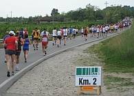Relativ steil und durch einen tiefgrünen, kühlen Hain senkt sich die Straße in ein Tal, neun Kilometer gelaufen. An der hübschen Umgebung ändert sich wenig. Hügelig, Weinfelder, bisweilen eine Wiese oder auch mal ein kleines Wäldchen. Gerade säumen blühende Akazien den Weg, danach verlangt die bisher markanteste Steigung ein wenig mehr Beineinsatz - kein Problem nach nur zehn gelaufenen Kilometern. Das Ende der Steigung bringt die „Deviazione“, den Abzweig für die Halbmarathonis. Nur wenige nutzen die kurze Variante und ein,