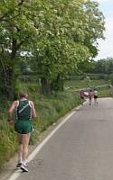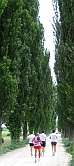 Dem Eingangsportal liegt ein ebensolches gegenüber, durch das ich das Anwesen wieder verlasse. Unter schattigen Bäumen gibt’s zwei Becher Wasser und dann weiter durch eine Allee aus gigantisch hohen, sicher steinalten Pappeln. Weit voraus die winzigen Läufergestalten, darüber die hohe „Pappelschlucht“ - was für ein Bild. Selbstverständlich fange ich das laufend ein. Den perspektivisch denkenden Fotografen stellt das Ergebnis allerdings nicht zufrieden: ‚Auf dem Bild wird man die Männlein kaum erkennen. Und wenn du das Bild dann auch noch auf Internet-verwertbare Größe schrumpfst, sind sie verschwunden!’ Udo bremst, stellt sich an den Wegrand und wartet. Blöderweise dauert es bald eine halbe Minute, bis eine Verfolgergruppe heran, vorbei und auf Schussweite entfernt ist. ‚Egal, ich hab’ doch eh noch eine Minute gut!’ Und weiter. Auf der Allee verbleibend überqueren wir eine abgesperrte Kreuzung. Der von den Pappeln gewährte Sonnenschutz bleibt erhalten, das Knirschen unter den Füßen weicht dagegen wieder dem „Tapp, tapp!“ auf asphaltiertem Grund. 37 Kilometer gepackt.