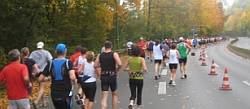 Vom See ist durch dichten Baumbestand nichts zu sehen. Vom Himmel auch nicht, der versteckt sich hinter zähem Hochnebel. Zuweilen sind hellere Flecken im fetten Grau auszumachen. Das nährt die Hoffnung (bei vielen die Befürchtung) bald die Sonne willkommen zu heißen. Im Übrigen herrscht ideales Laufwetter: Recht kühle Luft zwar, dennoch erlaubt Windstille kurzärmliges Laufen. Auf abgesperrter Walduferstraße windet sich der bunte Lindwurm in nun wieder leicht ansteigender Rechtskurve. ‚Ganz so flach, wie die Homepage schwärmt, scheint der Kurs doch nicht zu sein!’ Und tatsächlich folgt, der Logik einer Uferstrecke gehorchend, dem Auf das Ab. Ich schere ein wenig seitwärts aus. Von oben und vor buntem Blattwerk sollte eine attraktive Aufnahme gelingen. Zugleich halte ich nach der Zwei-Kilometer-Tafel Ausschau, die gemäß GPS-Messung am Handgelenk gleich folgen müsste. „Hast du die erste Kilometermarke gesehen?“ wende ich mich an meinen Nebenmann. Doch auch Dieter übersah die Tafel im dichten Aufgalopp des Feldes. Eine Pace zwischen 5:20 und 5:30 Minuten pro Kilometer peilt er an, um in seinem zweiten Marathon erstmals unter vier Stunden zu bleiben.