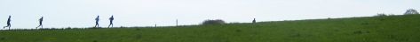 Eine mehr oder weniger flache Passage, zuletzt durch ein Dorf, liegt hinter uns. „Uns“, das meint meinen Verfolger, mich und „entsetzlicherweise“ einen weiteren Jäger, dessen muntere Schritte ich zuletzt auch noch vernehmen musste. Ein, zwei Minuten durch Wald und Feld isser knapp hinter mir, dann gleichauf und endlich vorbei. Seine rabenschwarze Bekleidung werte ich als Fanal wie diese „Sache“ heute für mich ausgehen wird. Rasch vergrößert sich der Abstand, nach zwei Minuten hat er schon zwanzig, dreißig Schritte Vorsprung. Der zweite Jäger hält sich einstweilen hinter mir. Dann geht’s einmal