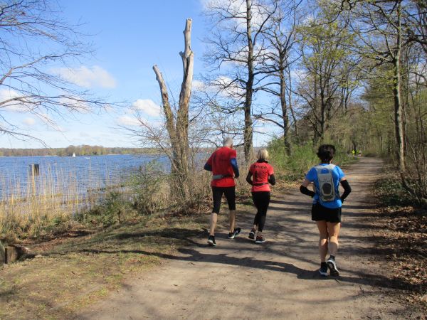 Inzwischen haben wir das Kanal- gegen das Tegeler Seeufer eingetauscht. "Wir" entstand schon kurz nach dem Start, eine Vierergruppe, als deren Schlusslicht ich fungiere. Vor mir trabt Grit Seidel, die Spitze hält ein munter plauderndes, mir unbekanntes Laufduo m/w. Grit Seidel kenne ich unter anderem vom Mauerweglauf (100 Meilen