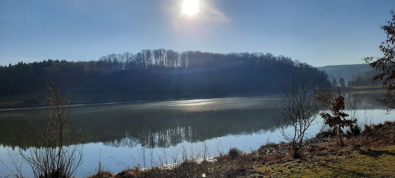 Um die Strecke zu beschreiben, fehlen markante Abschnitte. Stattdessen lasse ich Bilder sprechen, die die idyllischen Ansichten besser zur Geltung bringen als Worte das vermöchten. Einerlei, ob man den Blick über den Weg voraus, hügelauf oder übers Wasser schweifen lässt - schon dieser Tage, im eigentlich tristen Winter, weiß dieser Rundkurs zu gefallen. Auch dank der Sonne natürlich, die heute eine lichtblaue Kuppel übers Graugrün und Braun der Hügellandschaft spannt. Ufernah glänzt ein breiter Streifen aus nassem Schlick. Dem Gewässer fehlt - ich kann’s nur schätzen - vielleicht ein Meter zum normalen Pegel. Nach niederschlagsreichen Monaten ein Zustand, der sicher nicht mangelndem Zufluss geschuldet ist. Aus unbekanntem Grund hat man Wasser abgelassen und nun läuft das