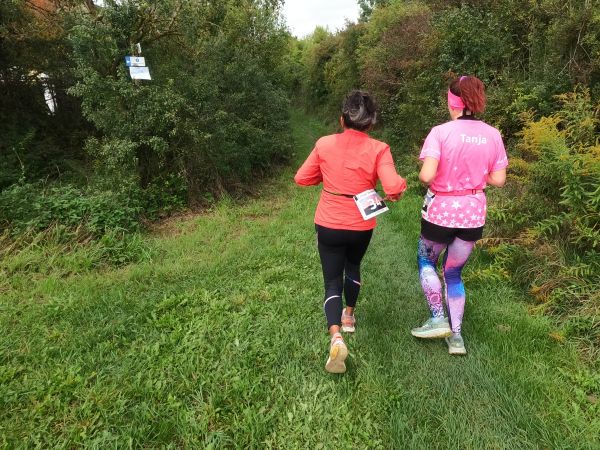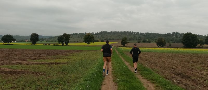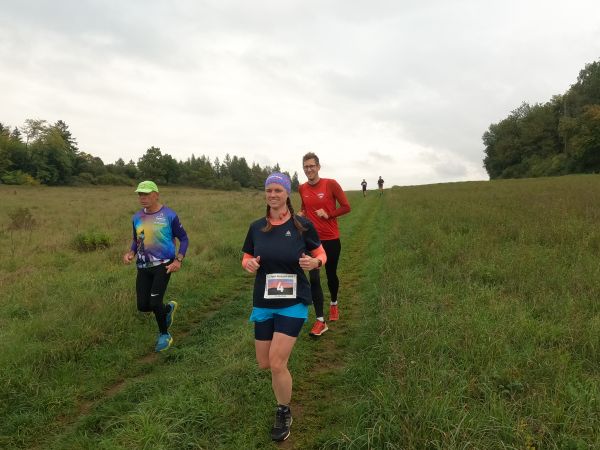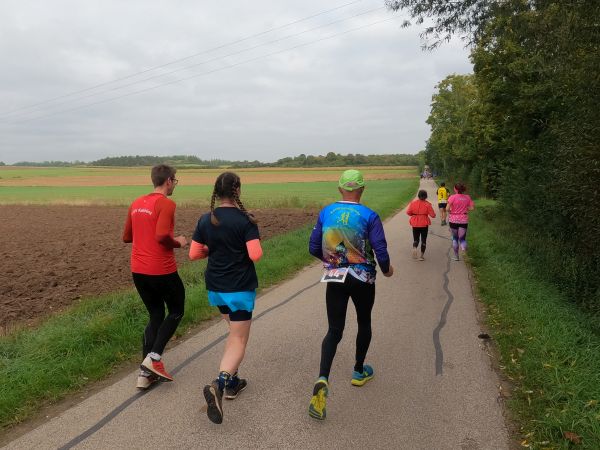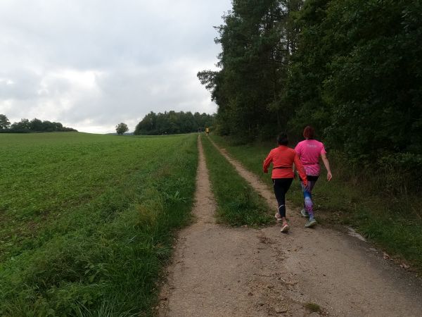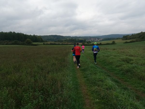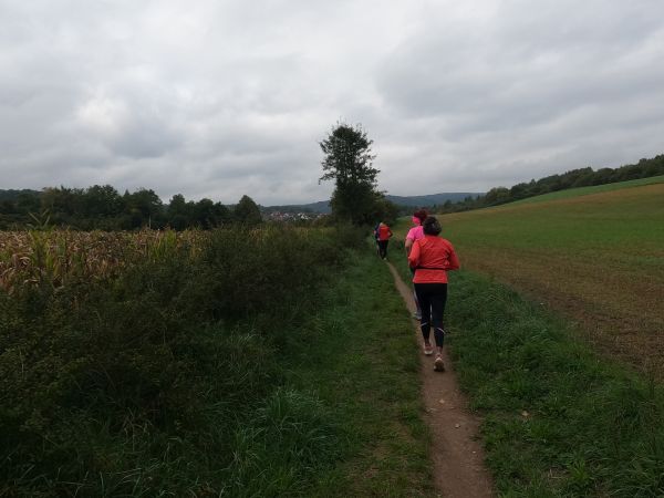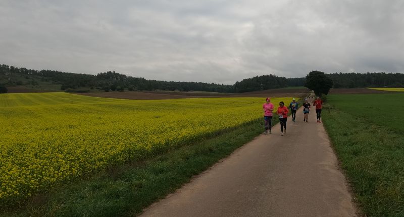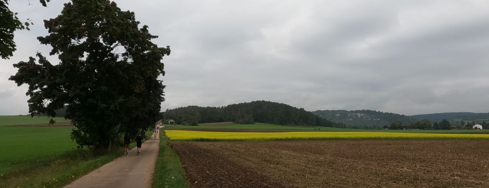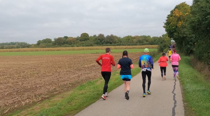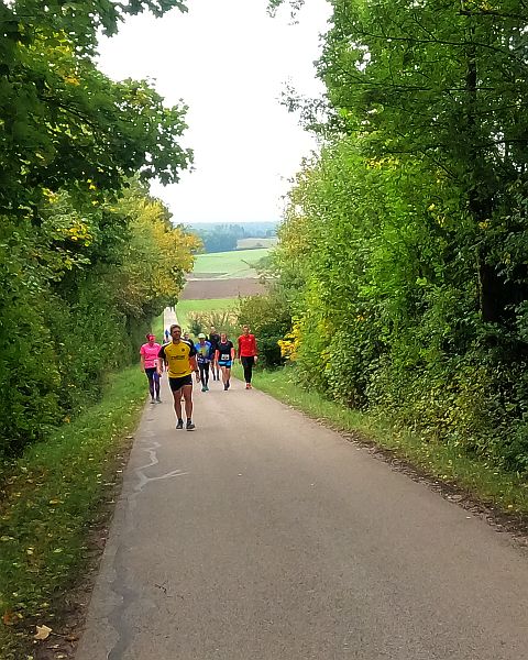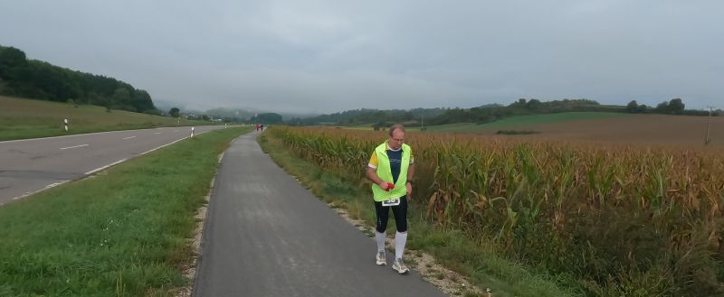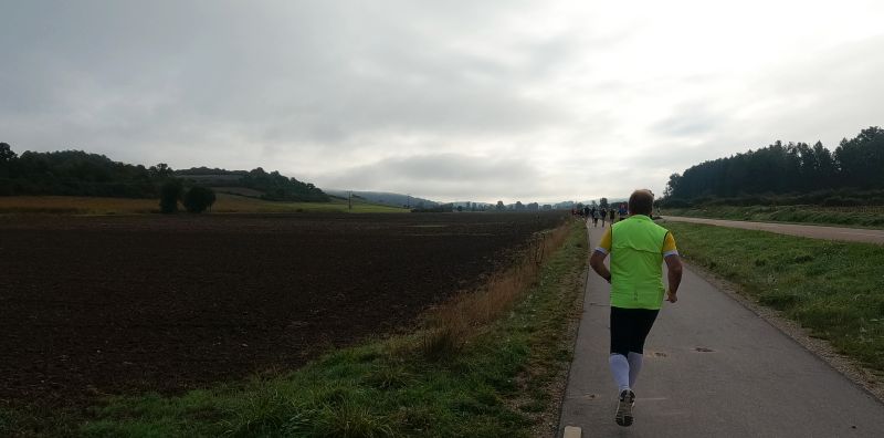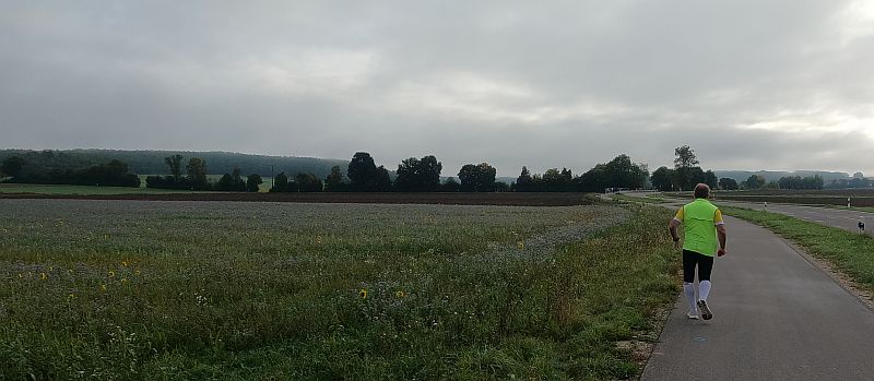 eine breite, weitgehend flache Mulde. Felder und Wiesen zur Linken, rechts hinter der Straße steigt das Gelände an. Auf dem Radweg parallel zur Straße und rascher als ich mir das vorstellte, zieht sich das Feld der gut 70 Beinpaare auseinander. Vor mir kaum mehr jemand und hinter mir … keine Ahnung ich drehe mich nicht um. Es ist noch zu früh die „Eile“ meiner „Mit-Backyarder“ zu hinterfragen. Was mich angeht, so versuche ich auf diesem ersten, dann dem zweiten Kilometer in Schwung zu kommen und dabei nicht zu schnell anzulaufen. Schon ein Schnitt von 7 min/km wäre in zweierlei Hinsicht überzogen: Er schont meine Bordreserven zu wenig und brächte mich nach gut einer Dreiviertelstunde ins Ziel. Für meinen Geschmack viel zu früh. Zum Verpflegen brauche