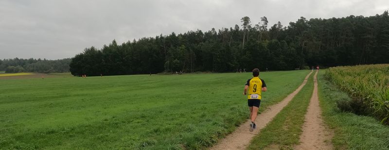 Das helle Intermezzo am Himmel war genau das: ein Intermezzo. Dichte Wolken haben wieder die Regentschaft übernommen, wodurch mich in der kurzen Wartezeit vorm Neustart in schweißfeuchter Kleidung mehr als nur ein Frösteln überkommt. Damit ist die Frage, ob ich vielleicht auf oben und unten „kurz“ umrüsten soll, erst einmal vertagt. Der Tross zieht unaufhaltsam davon, ich scheine wieder zu Tempovernunft gekommen. Vorbei an der Kapelle (A), ab hier freie, nun schon vertraute Sicht auf die von Äckern geprägte Landschaft. Ich sollte erwähnen: Der inzwischen absolvierte halbe Marathon hat Spuren in meinem Bewegungsapparat hinterlassen. Die Beine zu heben fällt schwerer, muskulär da und dort ein schwaches Ziehen. Darf ich erfahrungsgemäß ignorieren. Erschöpfung wird wachsen, mir aber sicher nicht das Finish verwehren. Und die Beschwerden in „bewegten Teilen“ werden erst zum Ende hin wirklich relevant nerven.