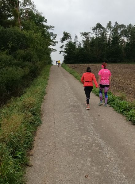 Zögerlich wird sich von den Stühlen erhoben, letzte Hand an sich gelegt. Schließlich schlendert man die paar Meter zur Startlinie. Noch summt es geschäftig im Bienenschwarm, keine und keiner ist müde, Geplapper allenthalben, da und dort ein Scherz. 5-4-3-2-1 - Los! Dem Geplapper gesellt sich Getrappel hinzu, der Tross bewegt sich Richtung Ortsende. Vorbei an der Kapelle (A), weiter auf dem Radweg parallel zur Straße (A-B). Für eine der Mitstreiterinnen ziehen sich die anderthalb Kilometer Radweg in die Länge, so lässt sie sich ihrer Nebenfrau gegenüber ein, der Rest vergehe dann wie im Fluge. Eine jener Bemerkungen, die mich zu Vergleichen über mein Empfinden „heute-früher“ anregt. Dieser Tage danke ich den Laufgöttern für jeden Meter „langweiligen“ planen Untergrund, verknüpfe ihn mit positiven Gefühlen. Früher hätte ich Wege vorgezogen, die vor allem eins bieten: Abwechslung.