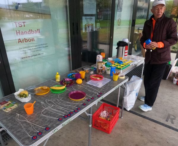 Unterm Vordach der Halle hat Christian Marti ein bemerkenswertes Büffet vorbereitet. Das erste meiner Gels spüle ich mit Wasser und Iso runter. Getränke von Christians Tafel. Die Opulenz dieser Tafel gilt es zu rühmen. Weitere Getränke: Cola, Limo und Kaffee. Darüber hinaus warten Snacks und Leckereien auf hungrige Läufer: Käsewürfel - wir sind in der Schweiz! -, Salzstangen, Kekse, Schokolade, Gummibären, Banane, Apfel und anderes mehr. Und das für lau! Christian Marti
