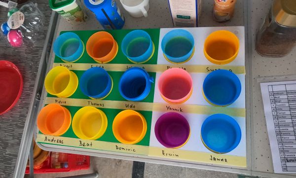 langwierig gesucht und identifiziert werden müssen (anderenorts so erlebt), harren sie in besagtem Becherhalter ihrer Benutzung. Mit Namen beschriftete Aufkleber auf dem Rahmen ordnen die Becher zu. Der Becherhalter entstammt dem 3D-Drucker eines Freundes, die Öffnungen kleidete Christian mit Moosgummi aus. Es zu wiederholen komme ich nicht umhin: All das ohne finanzielles Kapital daraus zu schlagen, einzig getrieben von der Freude an der Sache!