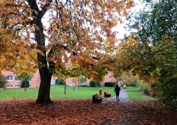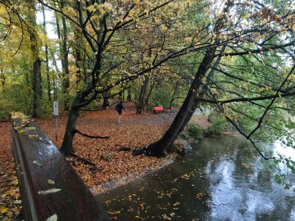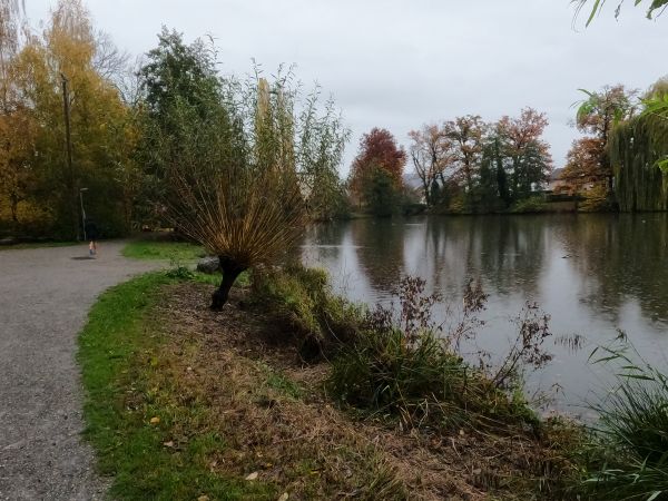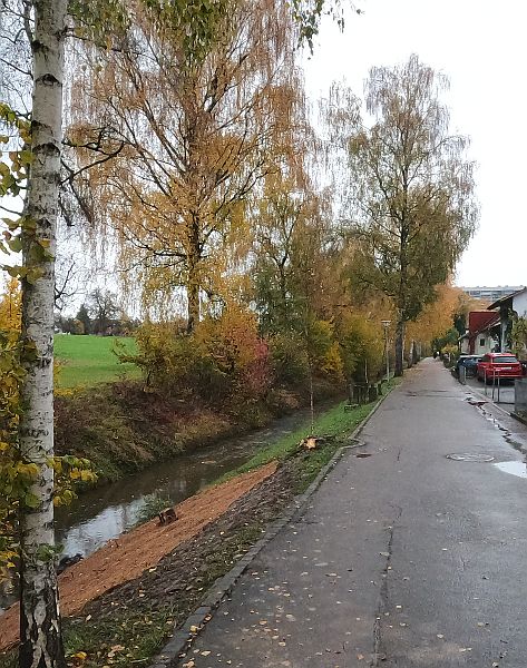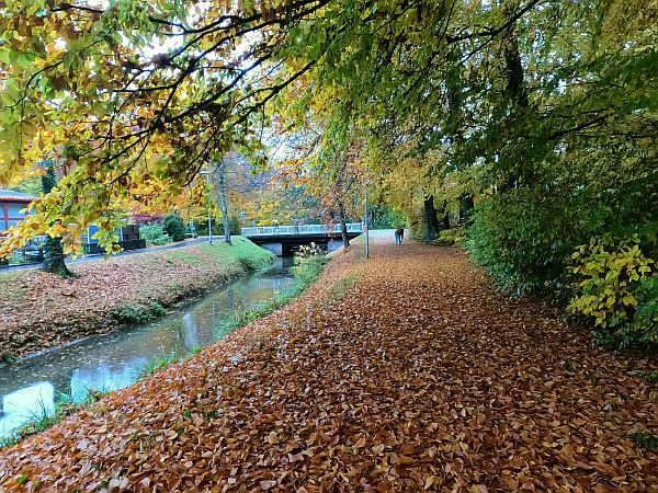 der unter düsterem Himmel allerdings nur einen Bruchteil seines Reizes entfaltet. Immerhin: wir haben Herbst. Immerhin: bunte Blätter, teils zu meinen Füßen, teils noch an Ästen auf die fall-entscheidende Windböe wartend. Farbe also, die der Stimmung ein wenig auf die Sprünge hilft. Ein Steg bringt mich über den zufließenden Bach Aach zur anderen Seite des Weihers. Der abfließenden Aach folge ich auf geschottertem Pfad, am Rande eines weiteren Wohngebietes.