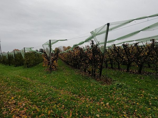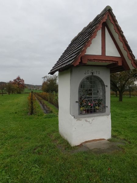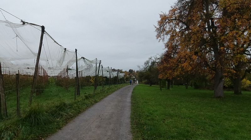 Nach etwa zweieinhalb Kilometern lasse ich die „bebaute“ Schweiz hinter mir und betrete Grünland. Grün von Wiesen und Grün von ausgedehnten Obstplantagen. Ich laufe an abgeernteten Spalieren vorbei, die mit Netzen vor geflügelten Räubern geschützt werden. Bei eingehender Betrachtung der Spannweite der Netze kommen mir allerdings Zweifel, welchem Risiko das Gespinst tatsächlich abhelfen soll. Vögel finden durch Lücken Zugang, mehr oder weniger steil fallende Hagelkörner träfen die Bäumchen mutmaßlich nicht. Also doch eher Schutz vor Hagelschlag? - Vorbei an einem Bildstock, errichtet im Jahr 1677, sofern Inschrift und meine Augen nicht