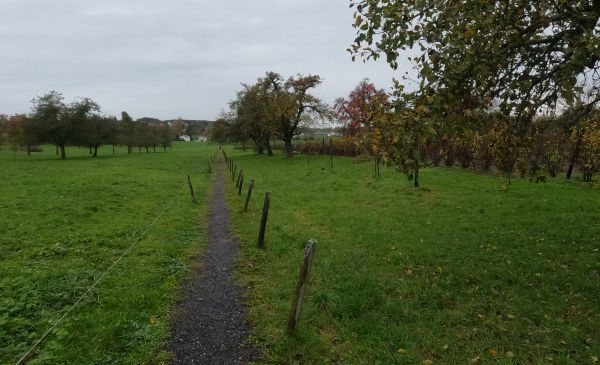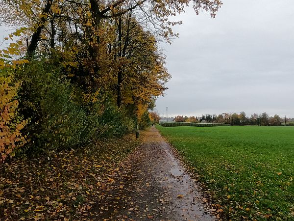 ein bisschen Gewerbe. Bebautes Land, hinter dem mich wieder natürliches erwartet. Natürliches aus Menschenhand, weitere Wiesen und Obstplantagen, durchschnitten und begrenzt von Straßen. Laufschritte auf meistenteils von buntem Herbstlaub gesprenkelten Wegen. Gelb-, Orange- und Rottöne, die mir auch entlang dieser Passage die gräßliche Witterung schönfärben. Wetter, das sich übrigens gar nicht mal so schauderhaft entwickelt in dieser ersten Dreiviertelstunde: Mehrfach stellt der Himmel die Beregnung ein und ein Lichtstreif am Horizont gen Westen lässt hoffen.