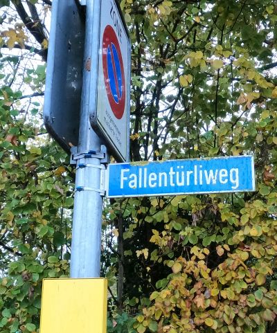 Ich laufe in der Schweiz, im Land der gehäuften, für bundesdeutsches Sprachverständnis putzigen Ausdrücke. Das gilt nicht zuletzt für Straßennamen, wie etwa diesen: „Fallentürliweg“. Ich bin enorm dankbar für die Ablenkung: Stammt die Bezeichnung tatsächlich vom hochdeutschen