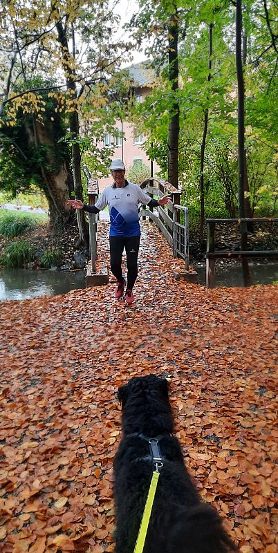 Am Ufer des Weihers, just beim Überqueren des schmalen Steges über die Aach, hellt sich mein Tag schlagartig auf. Zum Rudel-Stelldichein erwarten mich meine Frau Ines und Bobi, unser Hund. Kurze Pause, ebenso kurzer Austausch von Wohl und Wehe des Tages, dann reiße ich mich wieder los. Immerhin liegen noch fast 14 km vor mir … Wieso fallen mir die Schritte plötzlich leichter? Eine Sinnestäuschung, befördert