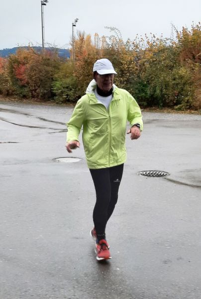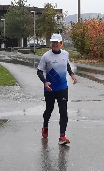 Ich ziehe die Regenjacke aus, streife ersatzweise ein Vereins-T-Shirt über und „stürze“ mich in Runde zwei. Unter der Pelle fühlte ich mich unwohl, schwitzte zudem mehr Wasser aus, als mich von oben beträufelte. Nur anfangs fröstele ich im durchschwitzten Oberteil. In Bewegung und weitgehender Windstille wird mir rasch wieder warm. Daran ändert auch der inzwischen
