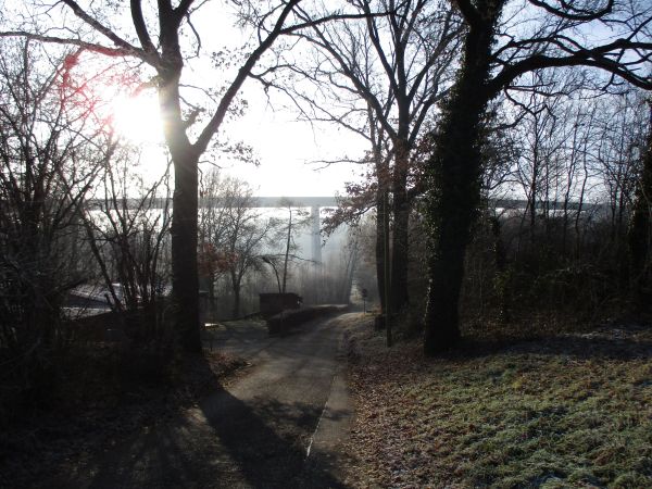 Es fiel mir stets leichter beim Ostfildern Marathon zu bestehen und dabei bis zuletzt guter Dinge zu bleiben, als auf diversen anderen Strecken. Das mag mit dem durchgehend guten Geläuf zu tun haben, ist vor allem aber Kopfsache. Doch, ja: mental liegt mir die Strecke. Mangels sonstiger Indizien führe ich das auf den steten Wechsel der Panoramen zurück. Im Körschtal herrscht Auenlandschaft vor. Wiesen, Gehölz, ein Bach, weidende Rinder sogar und als optischen Kontrapunkt auch noch die spektakuläre Brücke … Dann