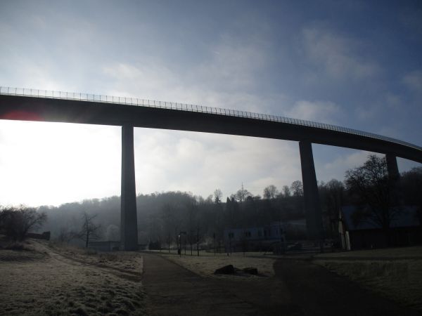 und trabe übergangslos im Bann der Körschtalbrücke. In spektakulärer Höhe (55 m) und mit beeindruckender Länge (700 m) überspannt sie das Tal. Ich trabe drunter her, akustisch begleitet vom gedämpften „Dammdamm, Dammdamm …“, das Fahrzeuge dort oben beim Überrollen von Stoßfugen in der Fahrbahn verursachen. Ich jogge auf Beton und mit geringem Gefälle talabwärts. Inzwischen bin ich eingelaufen und versuche meine Tagesform zu taxieren … Schwer einzuschätzen.