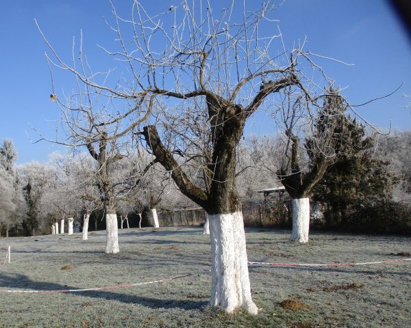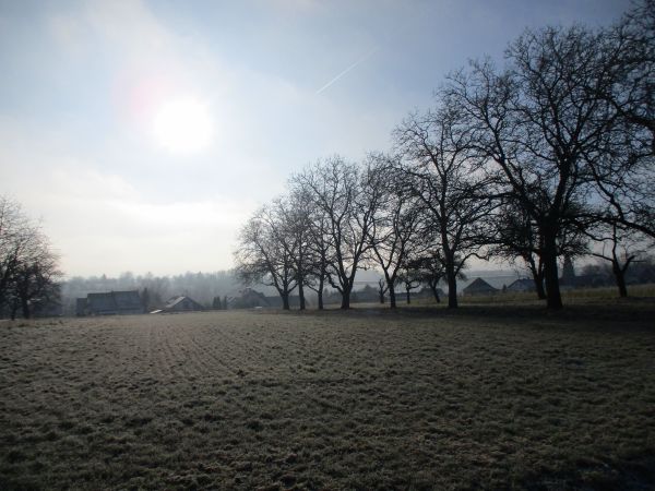 hin steiler und auch sie fordert mich heftiger als je zuvor. Zwischen Streuobstwiesen „hieve“ ich mich schlussendlich auf den einstweilen höchsten Punkt und wende mich dem nächsten, zu Ostfildern zählenden, für mich namenlosen Ortsteil* zu. Schon soeben aufwärts und hier auf den nächsten Metern mutet die Gegend ein wenig gespenstisch an: Bäume, Zäune, Wiesen - alles nach nächtlichem Nebel bereift. Vor tiefblauem Himmel wirkt die Szene wie „eingegraut“, wie von einer dünnen Schicht Asche überzogen. Nach und nach setze ich Haken hinter erwarteten Sehenswürdigkeiten. Da ist zunächst das Federviehgehege hinter nur kniehohem Zaun, mit seiner auch heute durcheinander tippelnden, bisweilen pickenden Versammlung von Hühnern und Laufenten. Nach etlichen hundert Metern zwischen Gärten richte ich erwartungsvoll meinen Blick in jene Richtung, wo das gelandete „Raumschiff“