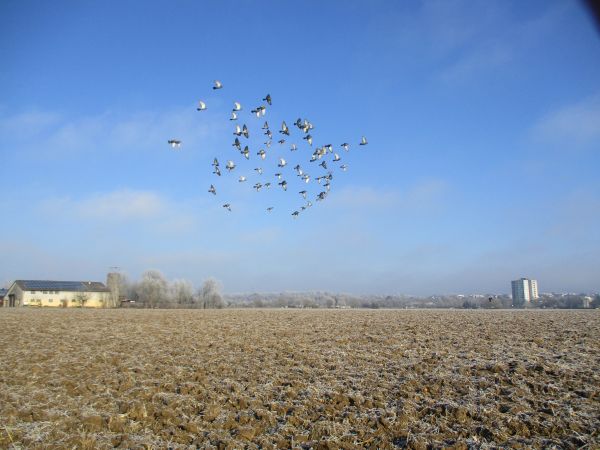 Erinnerung nimmt die Strecke vorweg, gibt die „Ideallinie“ vor. Frische, vom Veranstalter Michael Weber* ausgebrachte Markierungen, weiß auf grau, fallen dennoch unübersehbar ins Auge. Ein paar Meter in Nellinger Straßen, zick und zack, dann wieder hügelan und hinaus auf die „Filder“. Auch diese definitiv sanfte Steigung spüre ich intensiver, als in meinem Körpergedächtnis hinterlegt. Daneben koexistiert ungebrochen und mir selbst ein bisschen rätselhaft Optimismus. Gut fünf Kilometer und schon so … egal, ich schaffe das. Auf minimal ansteigender Betonstraße voran, vorbei an umgebrochenen Feldern. Vögel fliegen auf, stoppen meinen Lauf und tatsächlich gelingt es mir den Schwarm (Tauben?) mit der Kamera einzufangen. Schon im Antraben begriffen, bleibt mein Blick an anderem