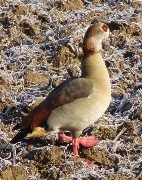 Gefieder hängen. Der Vogel wäre mir im von Reif überzuckerten Acker, seiner tarnenden Braun-Weiß-Färbung wegen, beinahe entgangen. Was für ein Tier ist das? Der Größe nach eine Gans. Aber keine Gattung, die ich kenne …** Ein paar Zoomfotos für spätere Web-Recherchen und weiter.