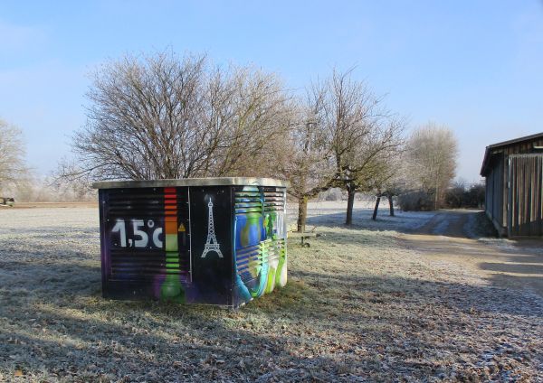 der unbekannte Künstler verzweifelt an eine längst überholte Utopie, das Klimaziel „1,5°C“. Neben der Zahl verewigte er die Silhouette des Eiffelturms, als Symbol für den Ort, wo sich die Staaten der Welt anlässlich der Klimakonferenz 2015 (!) auf den Maximalwert für die Erderwärmung einigten. Man glaubte damals an einen Durchbruch, zumal im Jahr darauf die wesentlichen CO2-Sünder, unter anderen EU, USA und China, das Abkommen ratifizierten. Der Wert war damit rechtsverbindlich. Aktuell werden wir darüber aufgeklärt, was „rechtsverbindlich“ international wie national bedeutet: wenig bis nichts. Die USA kündigten das Abkommen auf und viele andere CO2-Stinker, auch Europa und darin Deutschland, räumen anderen Zielen höhere Priorität ein. Aber das macht überhaupt nichts: wenn die Erde vielerorts unbewohnbar geworden sein wird, fliegen wir zu Planet B und laufen dort einen Marathon …