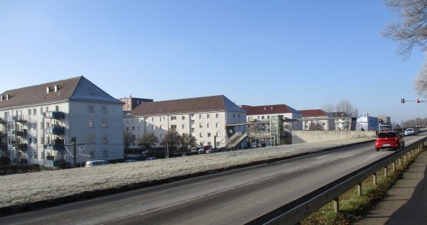 Vor mir öffnet sich die nächste von vielen langen Geraden auf der Route, ein Gehweg parallel zur Straße. Drüben, im jungen Ortsteil Scharnhauser Park, reiht sich Wohnblock an Wohnblock. Mehrstöckig wuchtige, ziemlich plump anmutende Gebäude, die auch nach dem Umbau ihren Urzweck, die Kasernierung von Soldaten, nicht