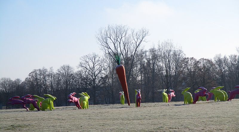 Einfachheit in der Gestaltung des Parks gefielen mir von der ersten Stunde an. Minutenlang jogge ich geradeaus, bis eines der seltsamsten Kunstwerke, das mir je unterkam, ins Blickfeld rückt: die „Sitz- und Flitzhasen“. Einzigartig und rätselhaft, mehr mag ich als ausgewiesener Kunstbanause dazu nicht sagen. Vielleicht noch das: Der Park wäre ohne die pinken und grünen Langohren sicher ärmer.