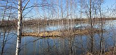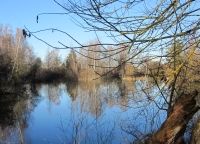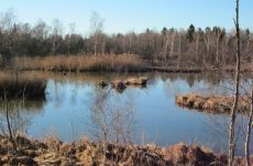 Vier Kilometer dauert der Anmarsch, die Roxi überwiegend am "Fuß" verbringt. Bereits hier umgeben uns Naturschönheiten, von denen niemand etwas ahnt, der auf der autobahnähnlich ausgebauten B 17 von Nord nach Süd, von Augsburg nach Landsberg, durch die eintönig flache Landschaft rast. Abgesehen von der Bergkette weit im Süden, hat die Gegend mit typisch bayrischen Postkarten-Ansichten überhaupt nichts gemein. Doch nur ein paar Fahrminuten abseits der "Rennbahn" B 17 locken idyllische Natur und Ruhe. So zum Beispiel dieser Fischweiher, der mir den ersten Fotostopp abnötigt.