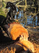 fähig ist. Kein Baum ist dem Biber zu dick, um Baumaterial für seine Burg herbei zu schaffen. Die Burg kann ich zwar nirgendwo entdecken, dafür aber etliche gefällte und angenagte Bäume. Eigentlich bin ich zum Laufen hier, gönne mir aber zwei Minuten Pause, zum Staunen und Fotografieren. Biber