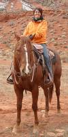 Mit zwei anderen Reitgästen folgt sie dem "Wrangler" auf den Spuren von John Wayne. Offensichtlich hat die Emanzipation auch vorm harten Ranch-Alltag nicht haltgemacht, denn ihr Tourguide ist eine Frau. Vom Geschlecht abgesehen, entspricht sie vollkommen dem Cowboy-Klischee: Dunkelblaue Jeans, Weste, gefährlich spitze Lederstiefel mit Absätzen und Sporen, dazu der unverzichtbare creme-beige Stetson auf weiblich langem Haupthaar. "Big Red" macht Ines' jahrelange Reiterfahrung überflüssig. Nach Kurzeinweisung durch "die" Wrangler könnte sogar ich den Zossen durch die Halbwüste lenken. Perfekte Ausbildung und lammfrommes Wesen dieser Pferde geben jedem reiterischen "Newbie" Sicherheit und Reitfehler macht Big Red vermutlich mit seiner Pferdeintelligenz mehr als wett. "Big Red" und Wrangler gehören zur "Red Cliff Lodge", einer in mehrerlei Hinsicht bemerkenswerten Bilderbuch-Ranch.