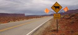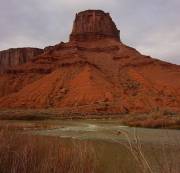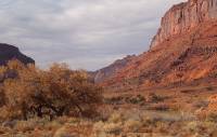 Die Straße 128 hat sich vom Colorado entfernt. Mangels Alternative bleibe ich dem Asphalt verbunden. Nur selten rauschen Autos oder Trucks auf der relativ unbedeutenden Nebenstraße vorbei. Trotz Flussnähe erstreckt sich beidseits der Straße karges Land. In rotem Sand wurzeln kleinwüchsige, graugrüne Büsche, sehr auf Abstand bedacht, um überleben zu können. Man ahnt die unerträgliche Sommerhitze sogar jetzt im November, da nach der von Monstersturm Sandy verursachten, kontinentalen Schlechtwetterperiode noch Schneereste auf Nordabstürzen liegen. Ja, für meinen Geschmack dürfte es gerne wärmer sein, wärmer als die 10°C, die ein bedeckter Himmel heute zulässt. Immerhin zeigen sich da und dort schon blaue Flecken am Himmel. Vielleicht hat die Sonne sich nicht den ganzen Tag frei genommen und bringt die Szenerie bald zum Leuchten. In dieser Gegend