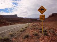 Nach einer (durchaus gern) gefühlten Ewigkeit taucht voraus mein Ziel auf, die Red Cliffs Lodge. Dahinter, Richtung Moab, verengt sich das Tal des Colorado extrem. Mehr als hundert Meter hohe, senkrechte Wände aus rotem Sandstein zwingen Fluss (und Straße) in einen engen Canyon. Genau der richtige Ort, um Ines' Traum vom Ritt im Wilden Westen wahr werden zu lassen. Ein Ort ... das erfahren wir später im Museum der Ranch ... an dem schon etliche Größen des Filmgeschäfts zu Gast waren, weil ringsum die denkbar schönsten Filmkulissen "einfach so in der Gegend herum stehen". Unvergessene Streifen wurden hier in Szene gesetzt, zum Beispiel das Roadmovie "Thelma und Louise" oder der