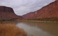 Eine rote Sandpiste zweigt mit leichtem Gefälle Richtung Colorado ab. Das Schild am Straßenrand verweist auf Stromschnellen und eine Möglichkeit Boote zu Wasser zu lassen. Kurzentschlossen gönne ich mir den Abstecher und stehe Minuten später am Ufer. Vor meinen Füßen zieht der Colorado ruhig vorbei, sprudelt ein paar Meter flussabwärts munter über Untiefen, um sich dahinter wieder vornehm träge in seinem Bett zu wälzen. Ich will zurück zur Straße und entscheide mich für ein trockenes Flussbett. Irgendwann ist der Gedanke einfach da: Gehe ich ein Risiko ein? Was ist mit Klapperschlangen? Nicht lachen! In den Wüsten des Westens gibt es Klapperschlangen. Pferde scheuen vor ihnen zurück und werfen ihre Reiter ab. Cowboys schießen den rasselnden Biestern mit "Colt" oder "Rifle" den Kopf weg. Kennt man doch, hat es in einschlägigen Western häufiger gesehen. Zum Beißen ist es ihnen heute aber sicher zu kalt, falls es die Viecher tatsächlich hier geben sollte (was ich aber nicht glaube*).